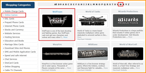 4. لشراء رمز softnyx epin, اضغط علىonline games تحت Shopping Categories ثم WolfTeam الذي يبدأ بحرفw تحت online games category