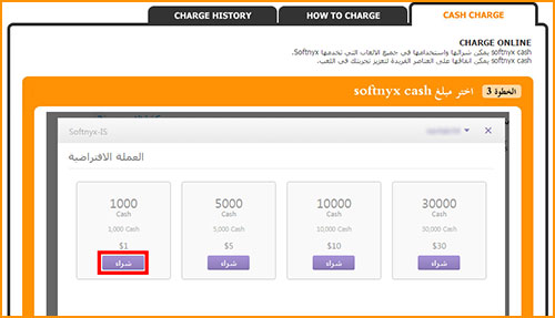 3. اختر مبلغ الكاش الذي تريد شحنه ثم اضغط على "شراء"