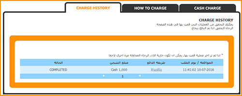 5. تأكد اذا كانت عملية الشراء قد اكتملت. يمكنك ايضا التحقق من العملية التي قمت بها في "CHARGE HISTORY"