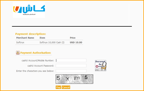 2.ادخل رقم حساب cashU الخاص بك و كلمة السر و الاحرف الخاصة الذي تراه. تم اضغط على pay.